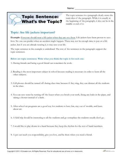 Award winning educational materials designed to help kids succeed. Worksheets are topic sentences work 1 what is a topic sentence,. Children practice identifying and writing a topic sentence, supporting sentences, and a conclusion in this narrative writing worksheet.